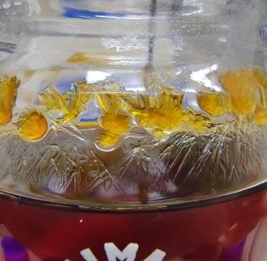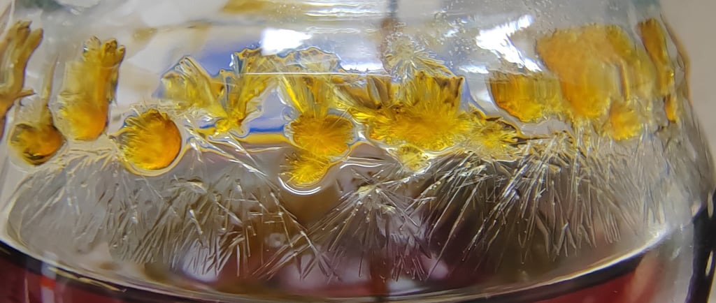 Fot. 1. Kryształy ergosterolu na ściance butelki z ekstraktem heksanowym z owocników grzyba
