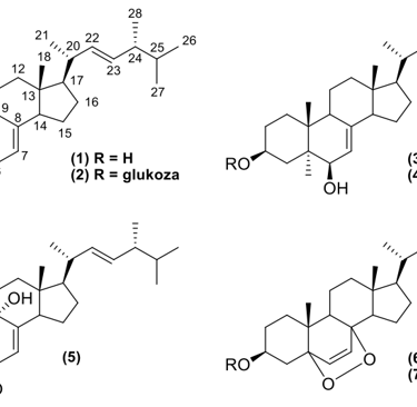 Sterole są niezbędne do zachowania właściwej struktury i funkcji błon komórkowych eukariontów. Każde królestwo organizmów żywych cechuje się obecnością specyficznych związków steroidowych, np. w królestwie grzybów dominuje ergosterol, dla roślin charakterystyczne są β-sitosterol i inne fitosterole, a dla zwierząt cholesterol. Steroidy wyizolowane z owocników H. erinaceum przedstawiono na rycinie 1. Najlepiej poznanymi spośród nich, a zarazem najważniejszymi są ergosterol oraz nadtlenek ergosterolu.