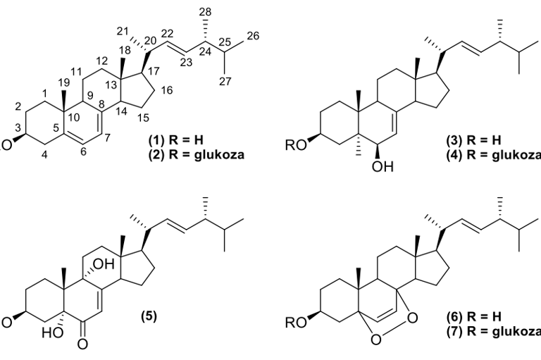 Ryc. 1. Steroidy wyizolowane z owocników H. erinaceum: ergosterol (3β-hydroksyergosta-5,7,22-trien) (1), 3β-O-glukopiranozyloergosta-5,7,22-trien (glikozyd ergosterolu) (2), cerewisterol (3), glikozyd cerewisterolu (4), 3β,5α,9α-trihydroksyergosta-7,22-dien-6-on (5), nadtlenek ergosterolu (6), 3β-O-glukopiranozylo-5,8-epidioksyergosta-6,22-dien (7)